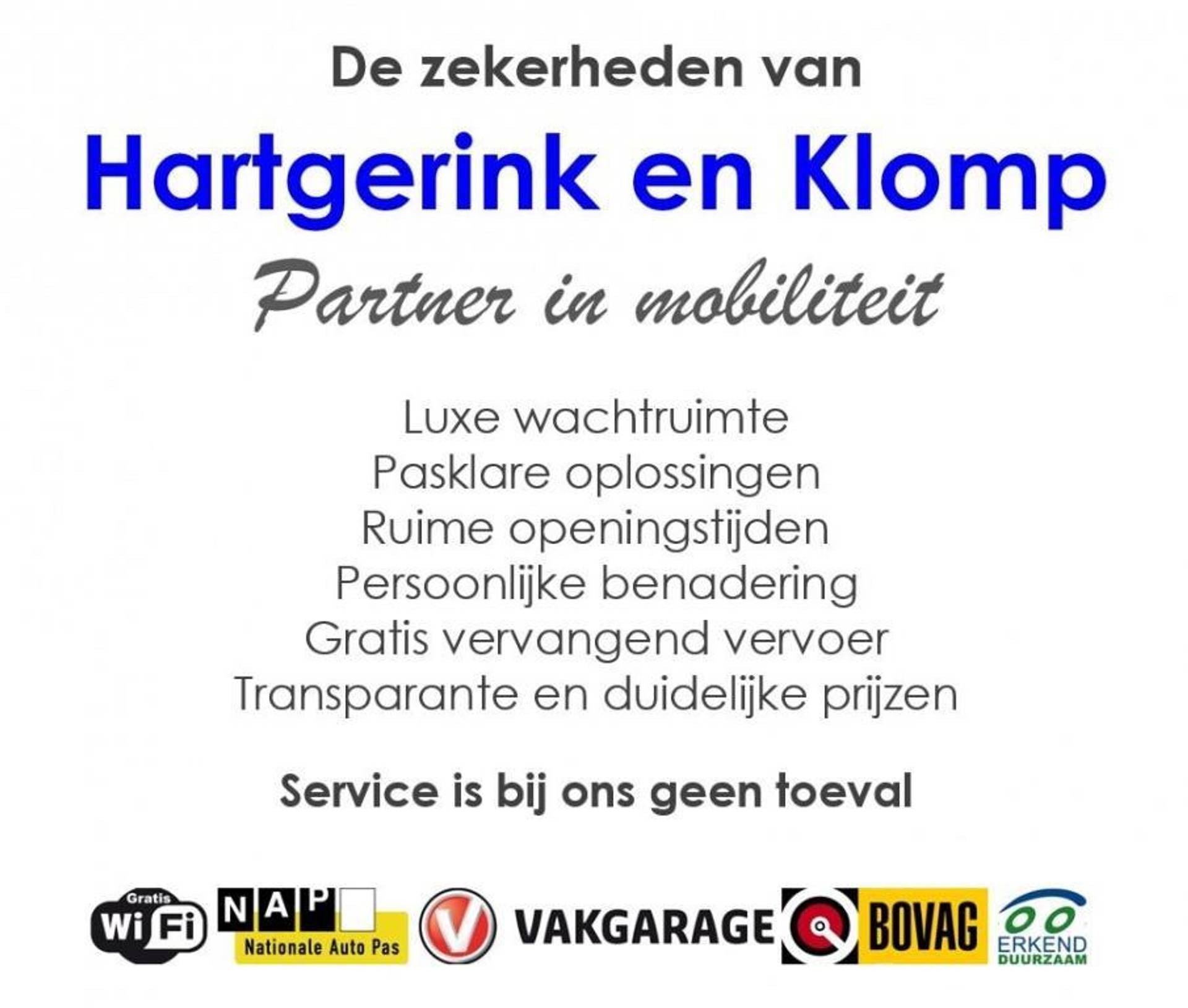 Hartgerink en Klomp, partner in mobiliteit. Een bedrijf waar de wens van de klant nog steeds centraal staat. Op het gebied van aanschaf en onderhoud van mobiliteit kan bij ons praktisch alles, zolang het maar kenbaar is. Met meer dan 90 jaar ervaring weten wij precies wat goed is voor uw auto, bedrijfswagen of camper en wat wij u te bieden hebben.