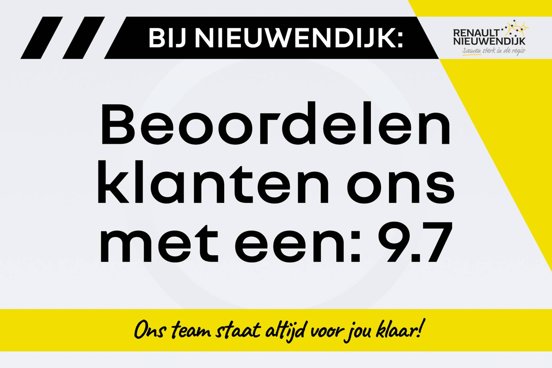 Wij hebben een grote voorraad met nieuwe auto's in diverse kleuren! Neem contact met ons op via 0297-383 080 of info@renault-nieuwendijk.nl voor de actuele voorraad.